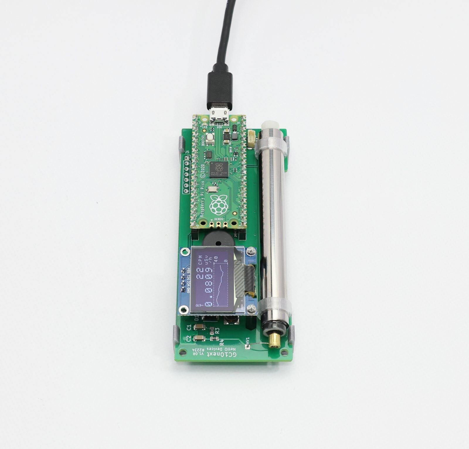 3.11震災以後に生産された高感度GM管 RD003 の採用および制御用MCUに Raspberry Pi Pico を採用し、仕様の近代化を図りました。